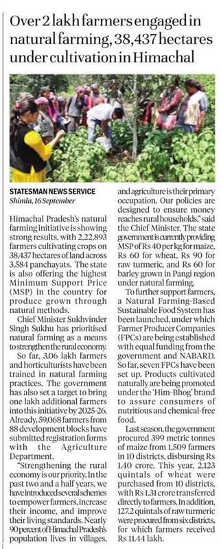 The Statesman: Over 2 lakh farmers engaged in natural farming, 38, 437 hectares under cultivation in Himachal